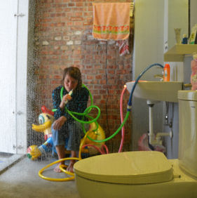 旅をしながら、見知らぬ人に声をかけ、蛇口とホースを持った写真を撮影します。